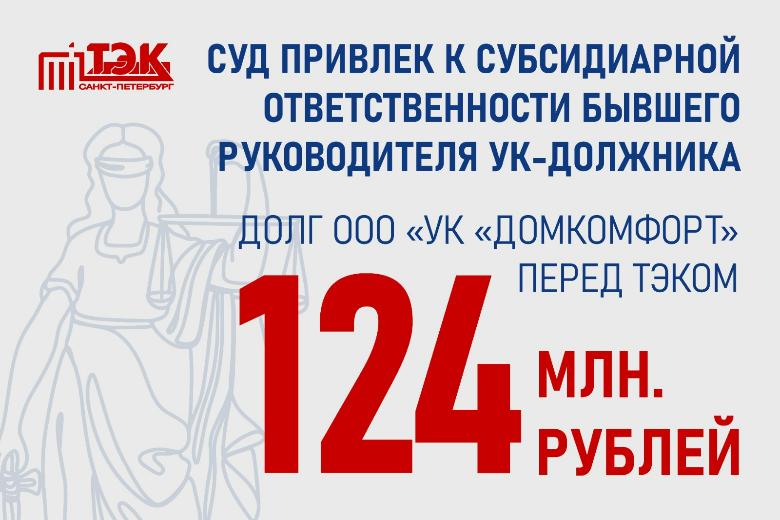 В августе 2024 года Арбитражный суд города Санкт-Петербурга и Ленинградской области удовлетворил заявление ГУП «ТЭК СПб» о привлечении к субсидиарной ответственности контролирующих лиц ООО «УК «Домкомфорт» – управляющей компании, обслуживающей три многоквартирных дома в Приморском районе, задолженность которой перед кредиторами составила свыше 153 млн рублей, из них 124 млн рублей долг перед ТЭКом.
