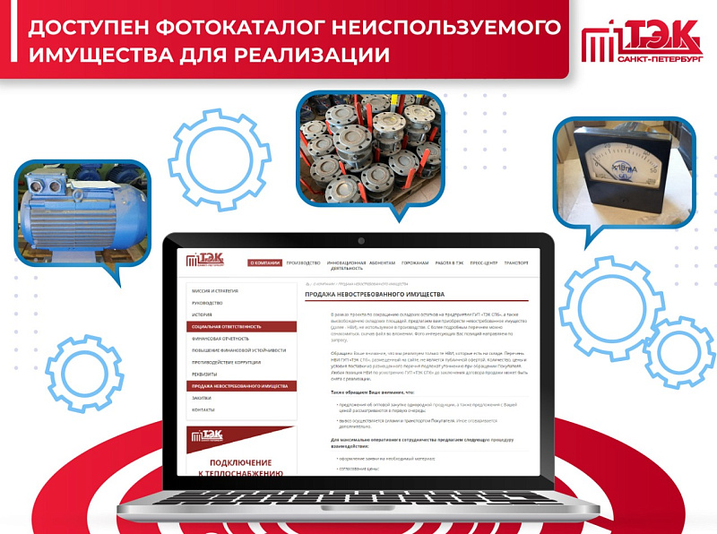 Реализация невостребованных ТМЦ ведется в строгом соответствии с законодательством в рамках проекта по оптимизации складских запасов. Продаже подлежит только невостребованное имущество, которое хранится на складе. Перечень ТМЦ ГУП «ТЭК СПб», размещенный на сайте, не является публичной офертой. Покупатель может уточнить количество, цены и условия поставки из опубликованного каталога. Фото ТМЦ предприятие направляет по запросу.